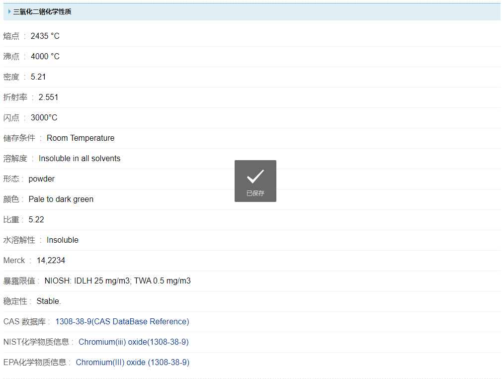 三氧化二鉻亦稱氧化鉻、氧化鉻綠、鉻綠,為暗綠色結(jié)晶粉末,有金屬光澤,屬于六方晶系或三方晶系,和α-氧化鋁是同一種晶型?;瘜W(xué)式Cr2O3,分子量151.99,相對密度5.21 (21℃),莫氏硬度為9,比石英、鋼還硬,熔點(diǎn)2266±25℃,沸點(diǎn)3000℃以上,化學(xué)性質(zhì)極其穩(wěn)定。有磁性,不溶于水和乙醇中,既耐酸又耐堿。即使在紅熱狀態(tài)下通入氫氣也幾乎不被還原。另外,和硫黃與硫化氫一起加熱也很難反應(yīng)。經(jīng)高溫灼燒過的氧化鉻綠對酸堿均呈惰性,但可與酸性熔劑共熔, 轉(zhuǎn)變成可溶性鉻 (Ⅲ)鹽。和溴酸堿金屬鹽水溶液一起加熱則反應(yīng)而溶解,能溶于熱的溴酸鉀溶液?;瘜W(xué)反應(yīng)方程式為:5Cr2O3+6BrO3-+2H2O→5Cr2O72-+4H+3Br2.